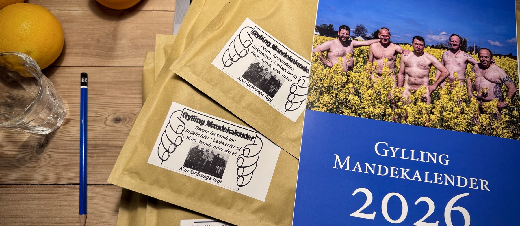 De første forsendelser af årets Gylling Mandekalender er allerede pakket og klar til at blive sendt afsted i morgen. Stemningen minder næsten om december hos selveste julemanden, for der bliver arbejdet flittigt, omhyggeligt og med et stort smil i “julemandens værksted”.